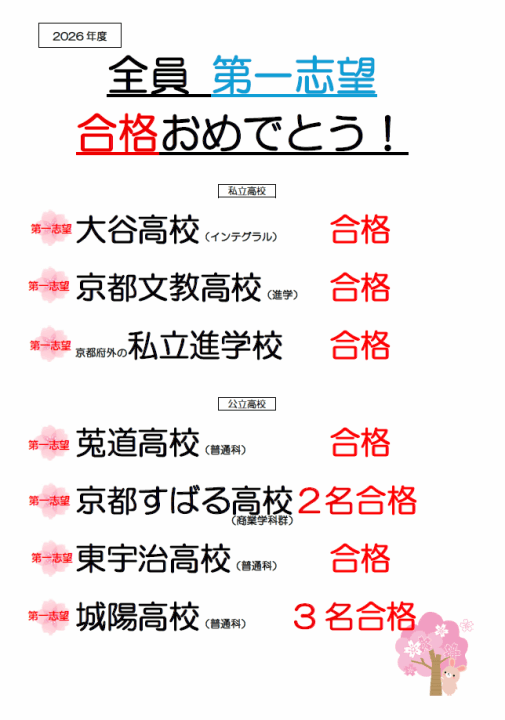 | 2026.03.17 | 中学3年生が、全員 第一志望の高校に合格することができました! おめでとう!! みんなの頑張りがいい結果に結びつきました。素晴らしいです。 |